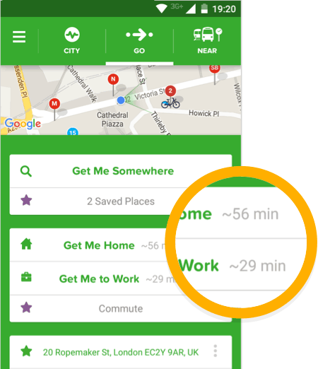 Now on your homescreen, we will instantly show you how many minutes you are from Home or Work.