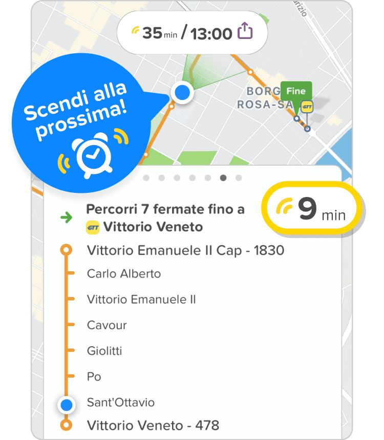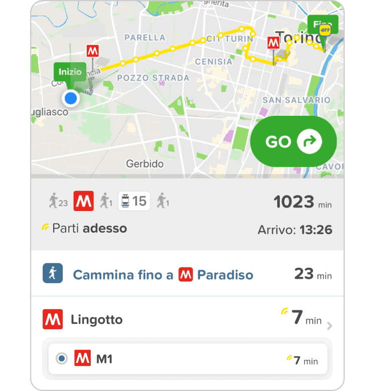 Quando premete GO, ogni svolta sarà comunicata e mostrata chiaramente sulla mappa. Se per caso sbagliate strada, il nostro algoritmo automaticamente capirà come aggionarsi - e continuerà ad indirizzarvi.