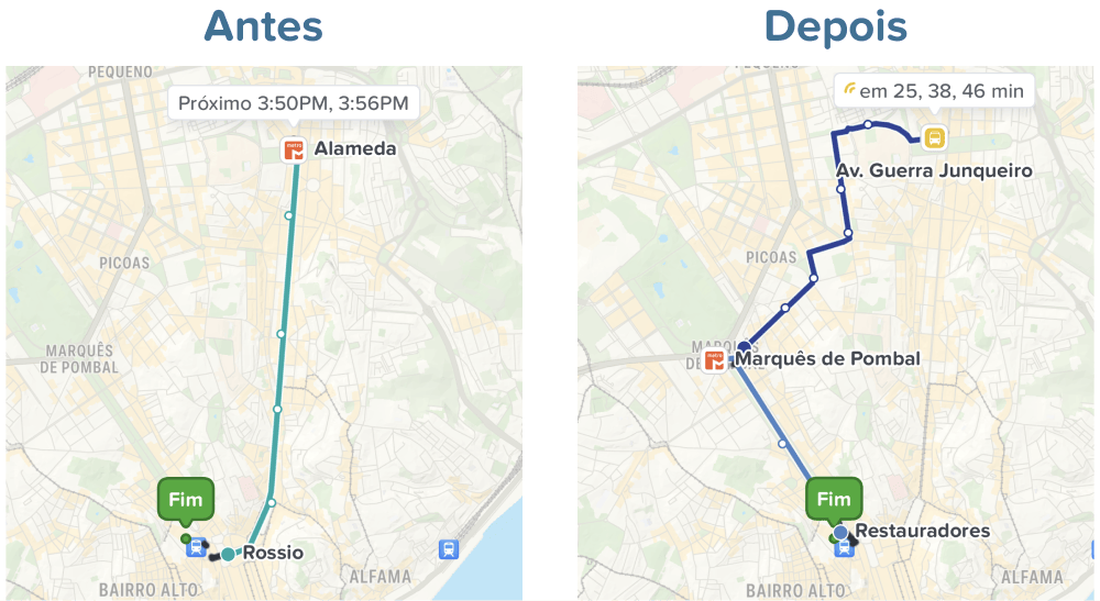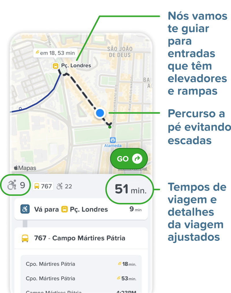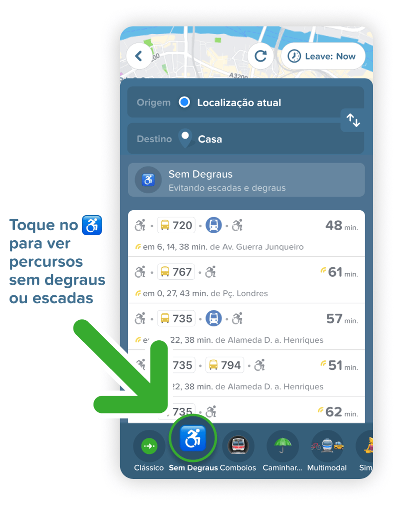 Agora os nossos resultados mostram percursos opcionais para utilizadores com mobilidade reduzida. Assim podes ir de um lado para o outro sem pisares escadas e utilizando os elevadores e rampas das estações. É também algo fixe se andas com malas ou simplesmente andas a passear com carrinho-de-bebé!