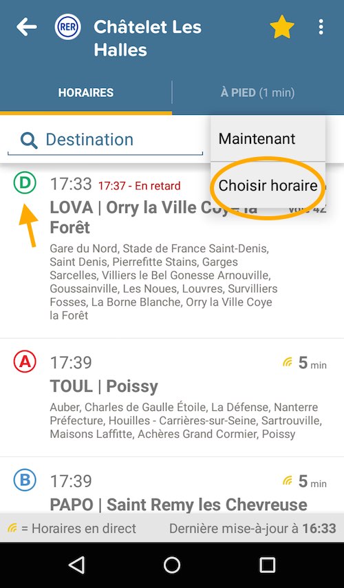 Vous pouvez maintenant voir les trains qui partent dans le futur, dans deux heures, deux jours, etc. Touchez "Maintenant" et sélectionnez une date et une heure.