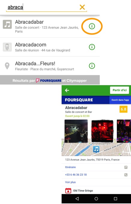 Nous travaillons toujours à des améliorations, la recherche d'adresse est maintenant mieux détectée, et vous pouvez afficher les infos du lieu Yelp ou Foursquare vers lequel vous souhaitez aller, avec le bouton ( i ) à côté d'un résultat.