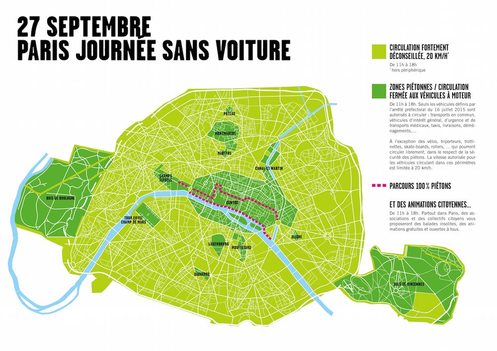 Cela ne concerne que quelques zones de la ville, de 11h à 18h, principalement autour de la Seine, entre République, Opéra, Concorde, Odéon et Bastille, ainsi que dans les bois de Boulogne et de Vincennes, le long des Champs-Élysées, du canal Saint Martin, de la rue Mouffetard, de la rue Daguerre et autour du Champ de Mars et de la Butte Montmartre. Bref les zones en vert sur la carte :