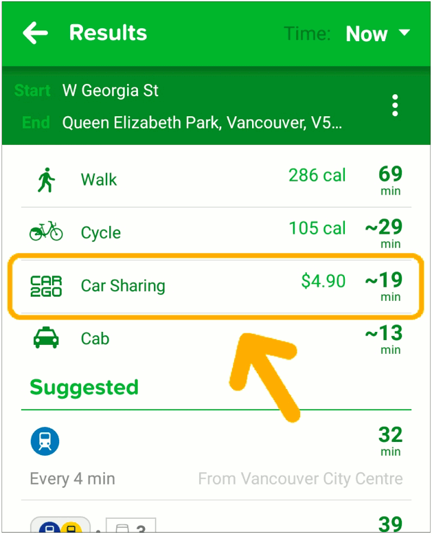 Whenever you plan a trip within Car2go's coverage area we'll show you a Car2go option alongside walking, cycling, taxi and public transport. We show you how long it takes, along with how much it costs.