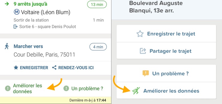Pour participer rien de plus simple : cliquez sur "améliorer les données" en bas de la page avec les détails de votre trajet et vous pourrez mettre votre expertise du réseau parisien au service de tous !